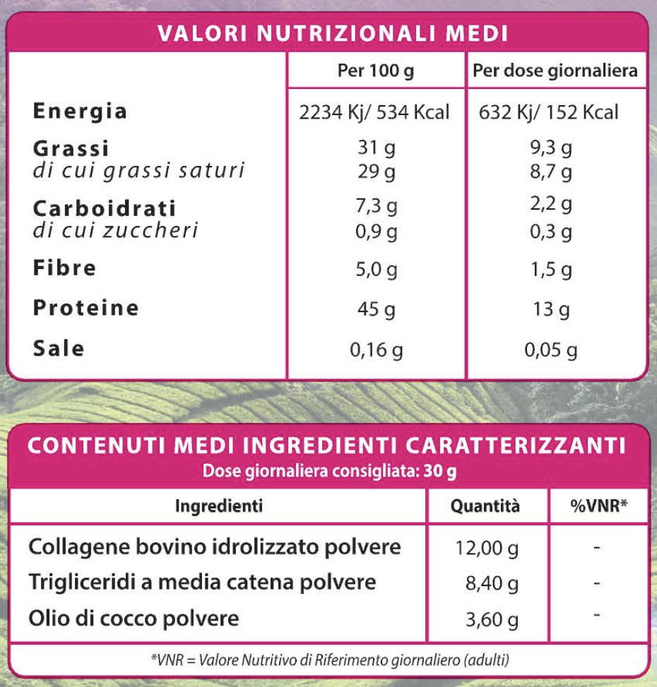 Contiene Collagene grass fed, Olio di Cocco e grassi MCT, cacao, stevia.